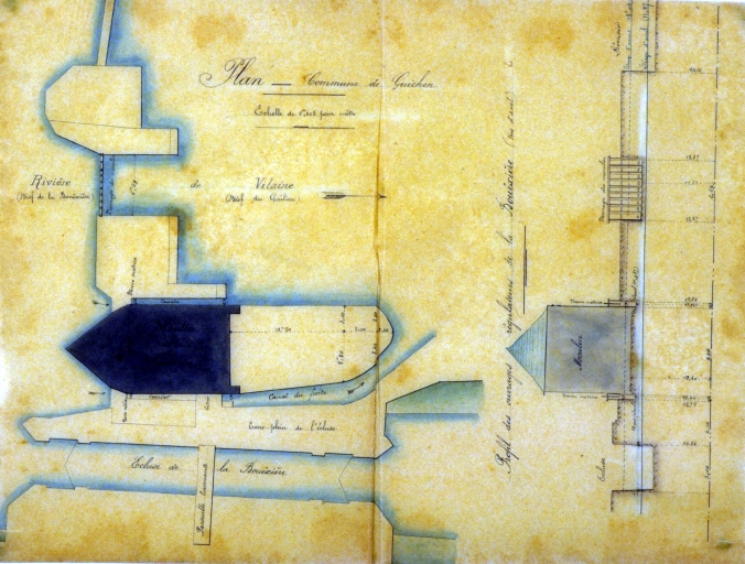 Plan et élévation du moulin et de ses ouvrages régulateurs (1884).Immatriculation