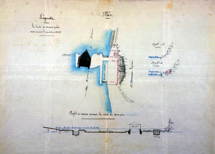 Plan de situation et profil en travers suivant la crête du déversoir (29 mai 1869).Immatriculation