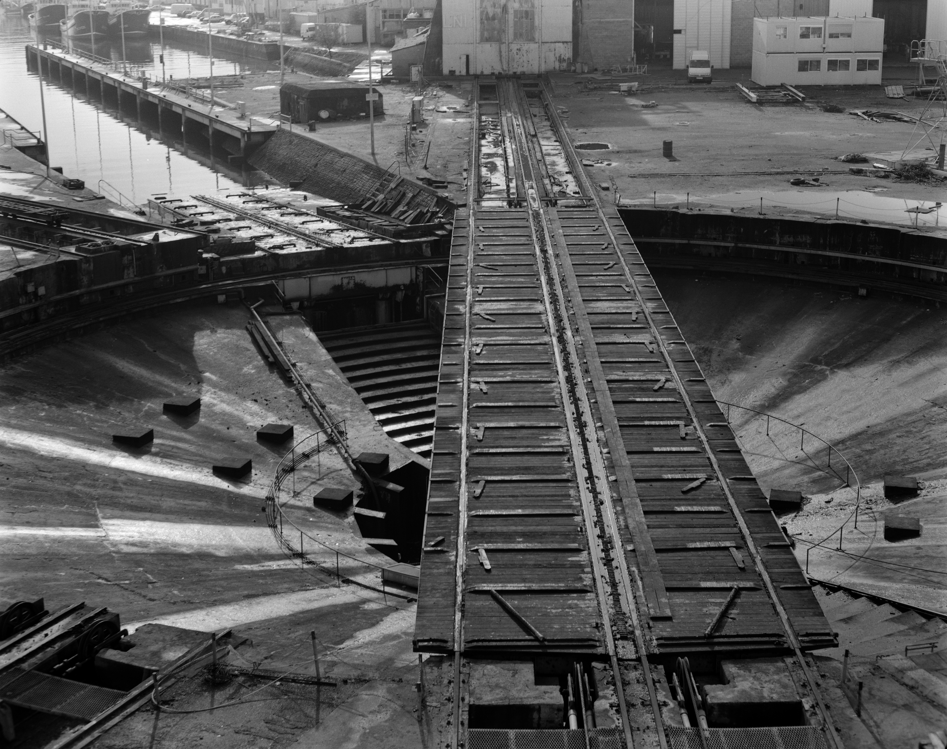 Vue du pont basculant et tournant en 2000. Sa voie ferrée spéciale à quatre rails est placée dans l'axe de la ligne de répartion du dom-bunker ouest. En haut à gauche, on distingue le haut de la rampe inclinée ou cale du slipwayImmatriculation