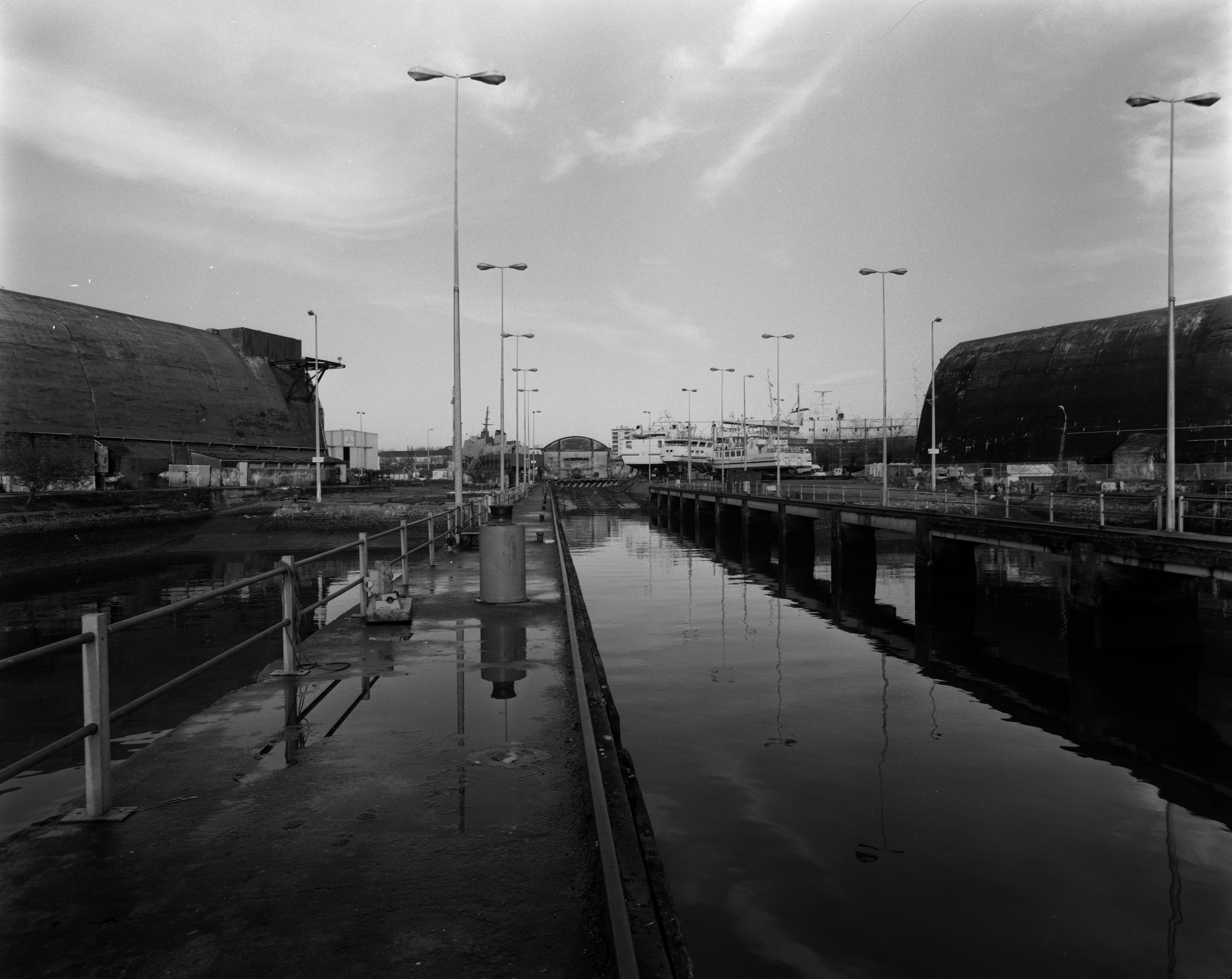Vue de l'aire de réparation navale en 2000. Au centre, la cale du slipway accessible depuis le bassin long du port de pêche de Keroman. De part et d'autre de la cale, les deux dom-bunkersImmatriculation