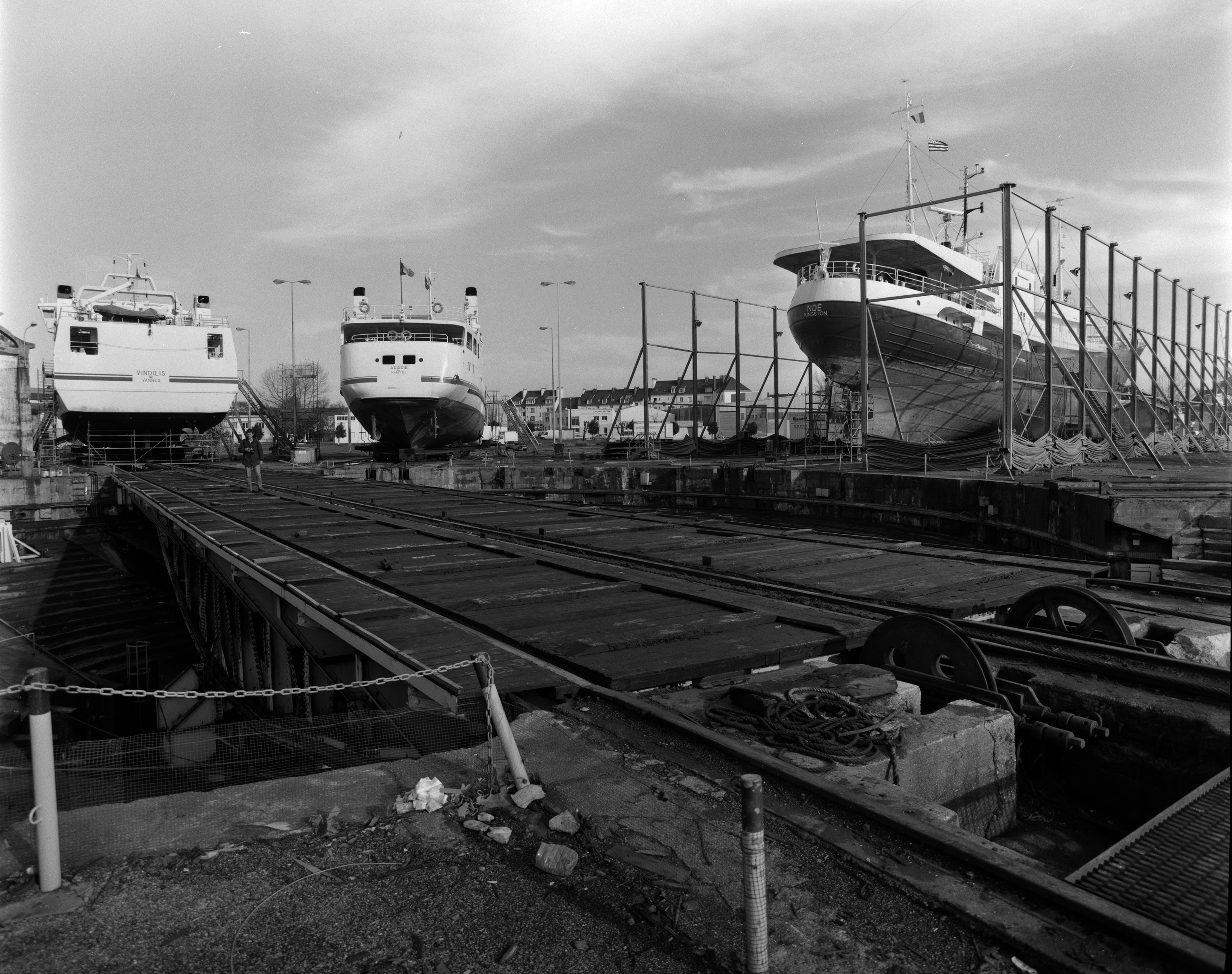 Vue du pont basculant et tournant en 2000. A l'arrière, les lignes de réparation navale n° 2 (Noé de Kingston), n° 3 (Acadie de Nantes) et n° 4 (Vindilis de Vannes)Immatriculation