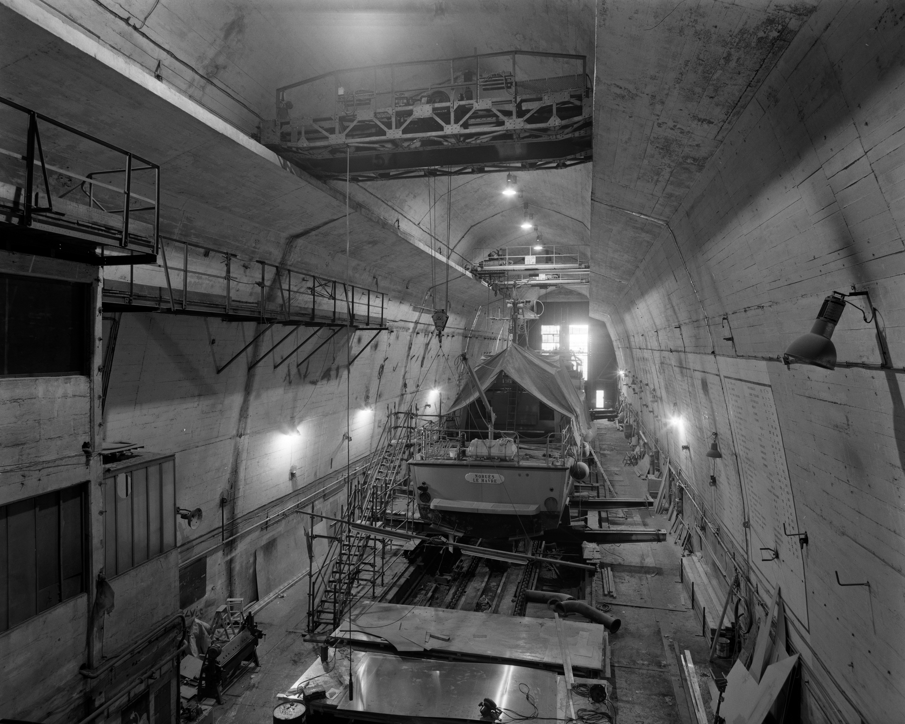 Vue générale de la nef vers le nord (état en 2000, chantier naval en activité) : navire en réparation. Au plafond, le pont roulant et son treuil en fonctionnementImmatriculation