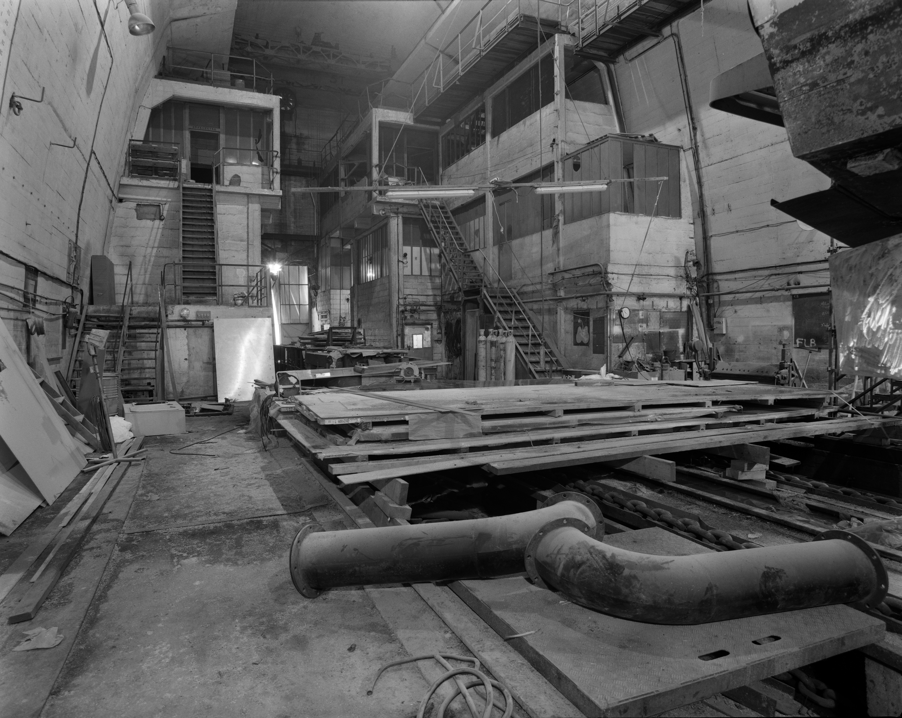 Vue de la nef vers le sud (état en 2000, chantier naval en activité) : de part et d'autre de la grande porte au centre, les ateliers et bureaux. Au niveau supérieur, les deux ponts roulants et leur treuilImmatriculation