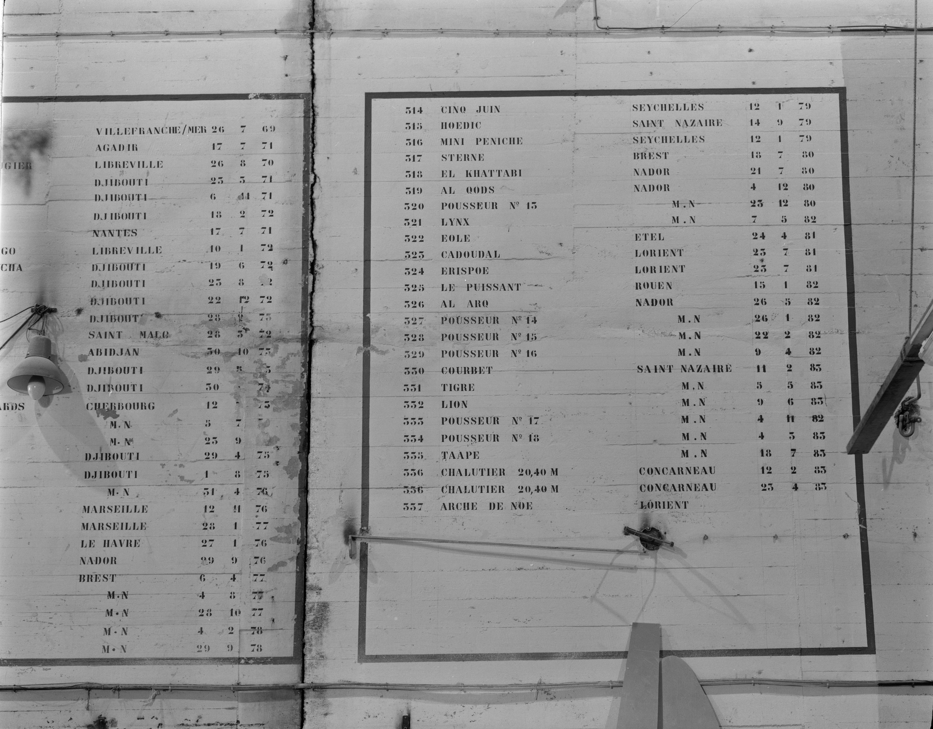 Vue de la peinture murale française de la nef (état en 2000) : noms des navires passés en entretien du 26 juillet 1956 au 23 avril 1983 avec leur port d'attacheImmatriculation