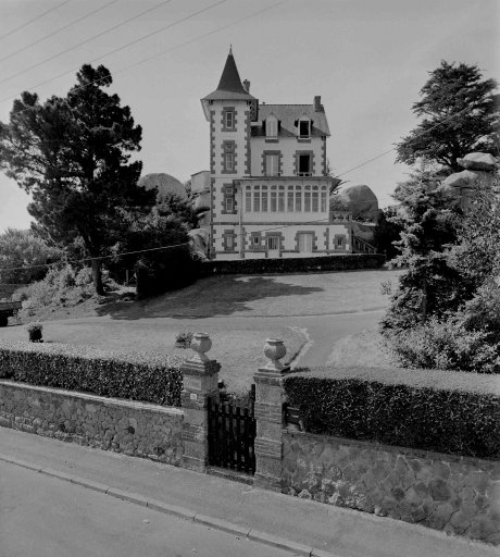 Trégastel : maison de villégiature dite Coz Castel (16 rue du Général de Gaulle) construite vers 1907 (attribuée à l'architecte Paul Jean François Courcoux) : vue d'ensemble.Immatriculation