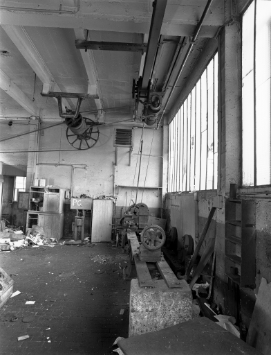 Vue générale de l'atelier de réparation : tour mécanique construit par A. Vernet, à Dijon.Immatriculation