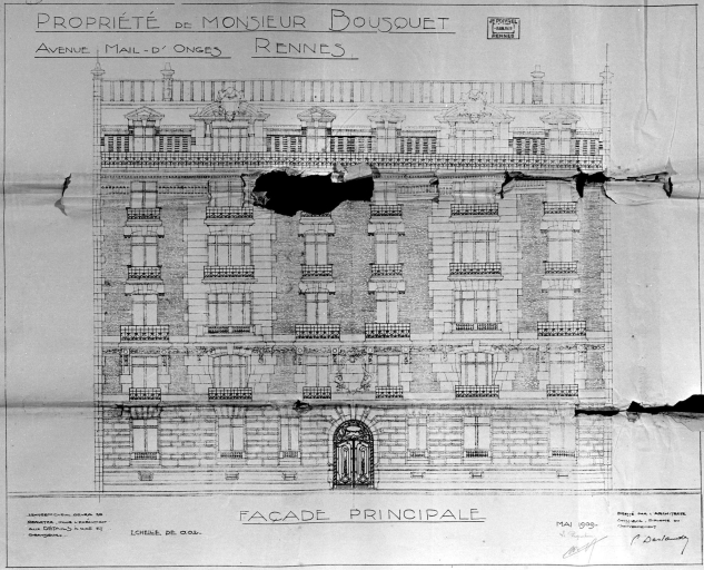 Elévation, par Delande architecte, 1909 (A. C. Rennes)Immatriculation