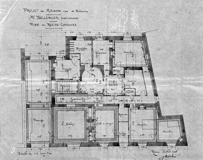 Plan du rez-de-chaussée, dessin par Georges Nitsch, 1908 (A. C. Rennes)Immatriculation