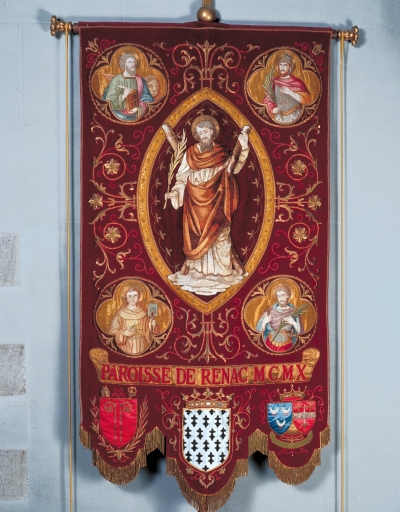 Bannière de procession paroissiale : Christ enseignant avec Sainte Famille, saint André, église Saint-André (Renac),