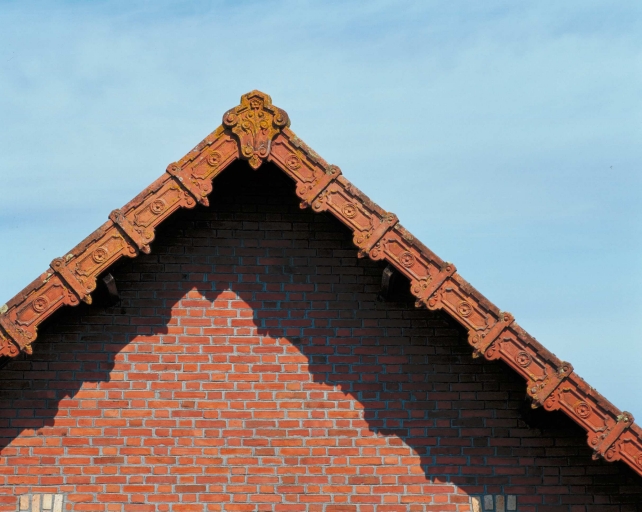 Détail d'architecture : décor de tuiles en acrotèreImmatriculation