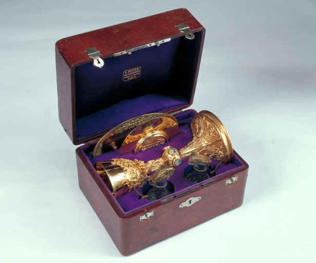 Chapelle et sa boîte : calice, patène, 2 burettes et leur plateau,