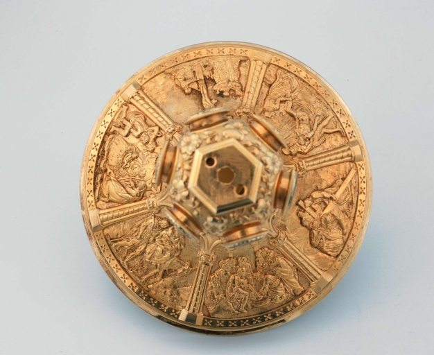 Chapelle et sa boîte : calice, patène, 2 burettes et leur plateau,