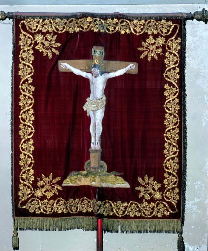 Bannière de procession paroissiale : saint Martin, Christ en croix,
