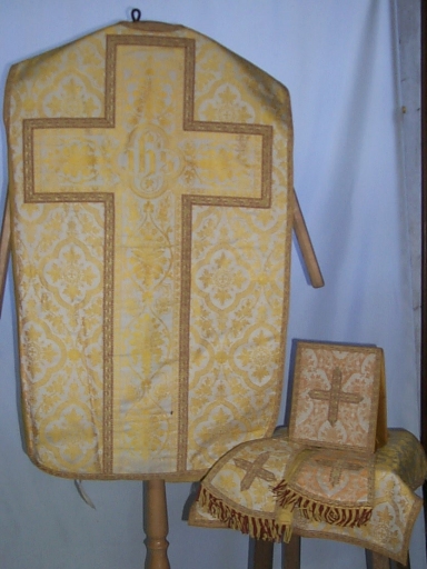 Ornement doré 1 : chasuble, bourse du corporal, étole, manipule, voile du calice,