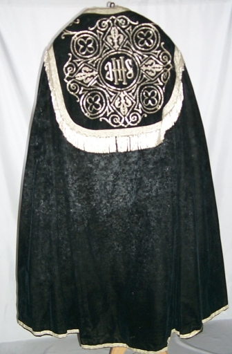 Ornement noir 1 : chape, chasuble, bourse du corporal, étole, manipule, voile du calice,