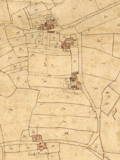 La ferme en 1826 sur le cadastre napoléonien ; ouvrage dessiné au plus haut sur l'extraitImmatriculation