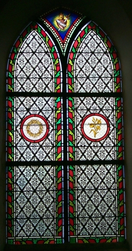 Verrière de la baie 10 : couronne de fleurs et branche de lysImmatriculation