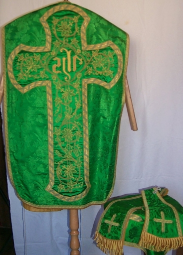 Ornement vert 2 : chasuble, étole, manipule, voile de calice,