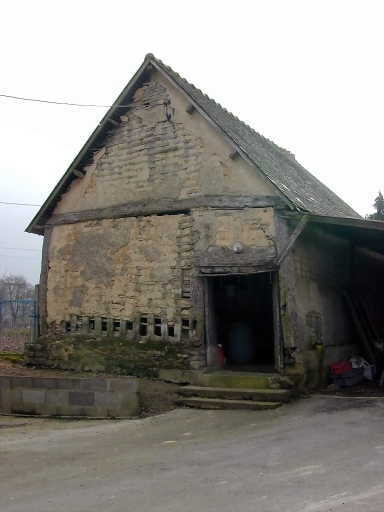 Vue générale : la grange construite en pan de bois et torchisImmatriculation