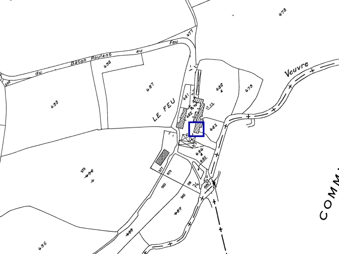Extrait du cadastre de 1980 ; le détourage représente les vestiges encore visiblesImmatriculation