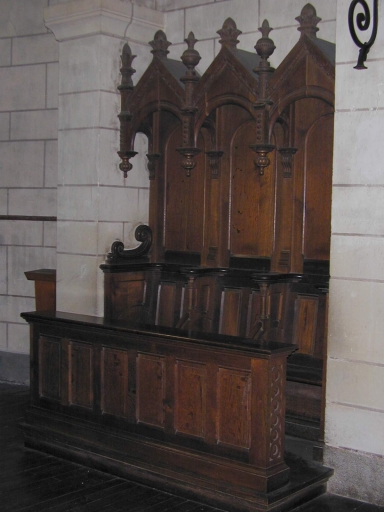 Stalles (2x3) ; fauteuil de célébrant ; lambris de revêtement,