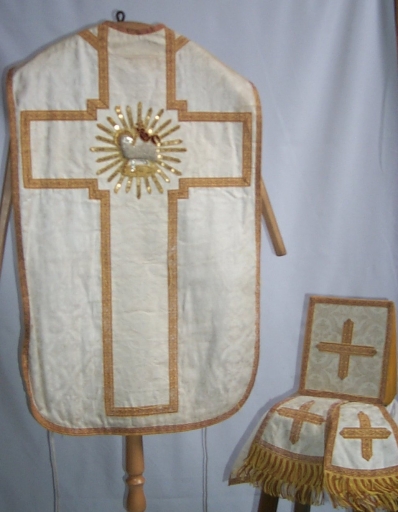 Ornement blanc 2 : chasuble, bourse du corporal, étole, manipule, voile de calice,
