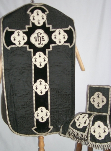 Ornement noir 3 : chasuble, bourse du corporal, étole, manipule, voile de calice,
