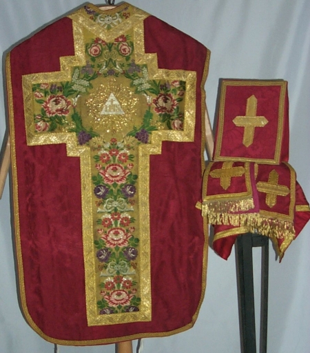 Ornement rouge 2 : chasuble, bourse de corporal, étole, manipule, voile de calice,
