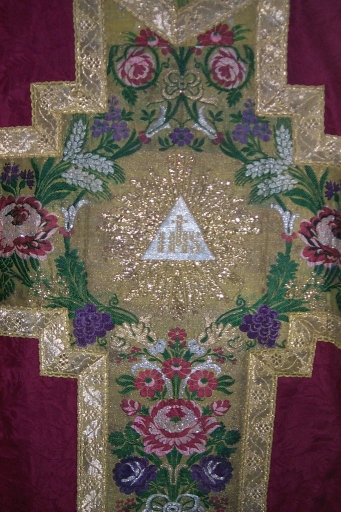 Ornement rouge 2 : chasuble, bourse de corporal, étole, manipule, voile de calice,