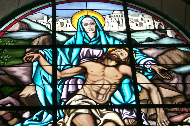 Ensemble des 2 verrières à personnages des baies 5 et 6 : Calvaire et Déposition,