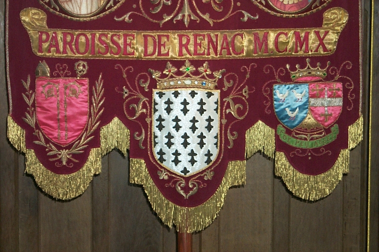 Bannière de procession paroissiale : Christ enseignant avec Sainte Famille, saint André, église Saint-André (Renac),