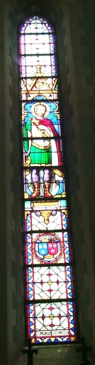 Ensemble des verrières à personnages des baies 0 à 4, 7, 8 : Vierge à l'Enfant, sainte Elisabeth, saints André, Jean-Baptiste, Maurice, Fiacre et Joseph,