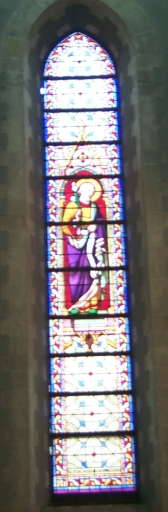 Ensemble des verrières à personnages des baies 0 à 4, 7, 8 : Vierge à l'Enfant, sainte Elisabeth, saints André, Jean-Baptiste, Maurice, Fiacre et Joseph,