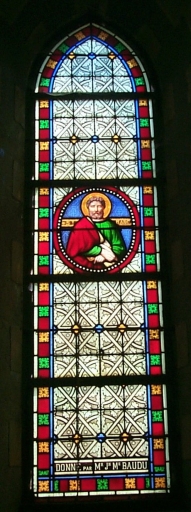 Ensemble des verrières à personnages des baies 9 à 16 : sainte Anne, saints Alphonse, Jean, Louis, Marc, Julien, Baptème du Christ,