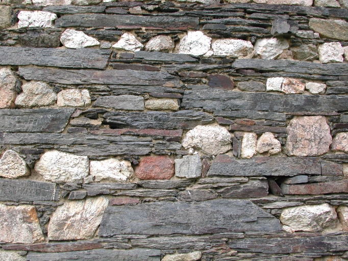 Détail : façade sud, appareil alterné de moellons de schiste et de quartzImmatriculation