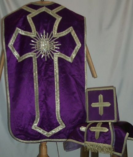 Ornement violet 2 : chasuble, bourse de corporal, étole, voile de calice, manipule,