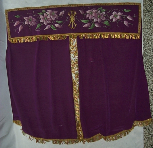 Ornement violet 2 : chasuble, bourse de corporal, étole, manipule, voile de calice, conopée, étole pastorale, chape,