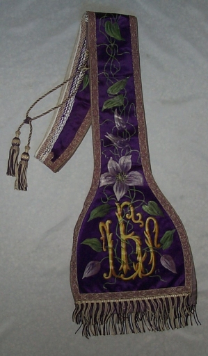 Ornement violet 2 : chasuble, bourse de corporal, étole, manipule, voile de calice, conopée, étole pastorale, chape,