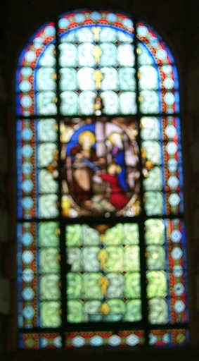 Verrières à grisaille figurée des baies 3 et 4 : sainte martyre, Sainte Famille,