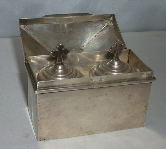 Ampoule à huile des catéchumènes et ampoule à saint chrême et leur coffret,