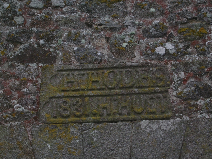 Façade antérieure sud, pierre gravée 'H:HODEE / 1831.H:HUET'Immatriculation