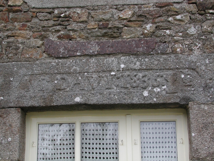 Détail : façade antérieure sud du logis, linteau de la porte d'entrée gravé : 'M:DAVY:1832 [calice] [?]'Immatriculation