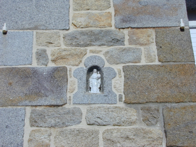 Façade abntérieure, niche à statue gravée de la date de construction : détailImmatriculation