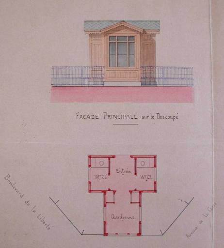 Façade principale sur le pan coupé et plan, dessin, Jean-Baptiste Martenot, 1886 (AC Rennes)Immatriculation