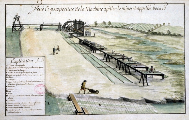 Planche extraite du manuscrit De Robien : Vue et perspective de la machine à piler le minerai appelée bocard (1735).Immatriculation