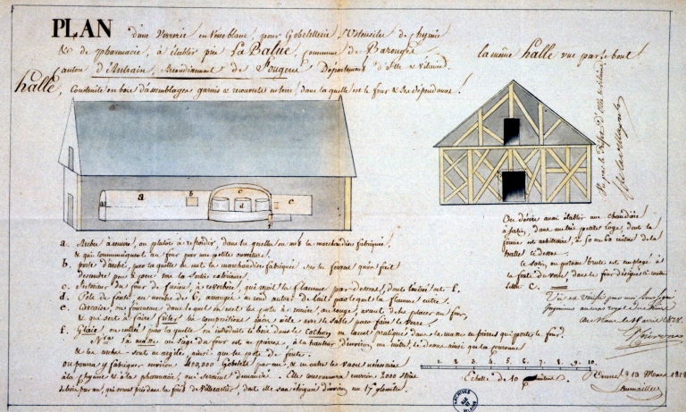 Elévations de la halle de la verrerie en blanc pour gobeleterie, ustensiles de chimie et de pharmacie (13 mars 1818).Immatriculation