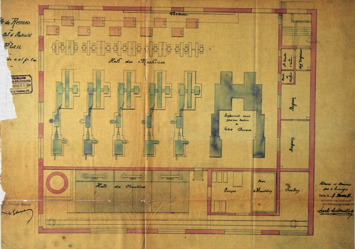 Plan de l'usine centrale d'électricité représentant la salle des machines et des chaudières (9 mars 1891).Immatriculation