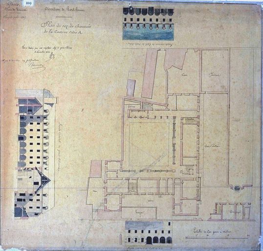 Caserne, projet de 1824 par Jary, plan du rez-de-chaussée et élévations. AD Morbihan 1Fi100.Immatriculation