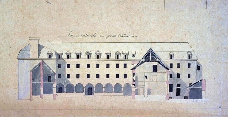 Caserne, projet de 1824 par Jary, élévation et coupe de la façade orientale. AD Morbihan 1Fi100.Immatriculation