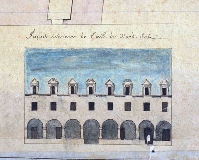 Caserne, projet de 1824 par Jary, élévation de l'aile nord-est. AD Morbihan 1Fi100.Immatriculation